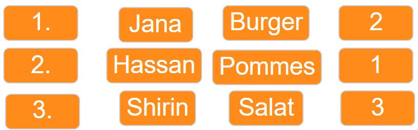 - Jana hat ihre Bestellung abgeholt und die Bestellung muss nun entfernt werden. Die restlichen Bestellungen rücken je eine Position weiter nach oben.