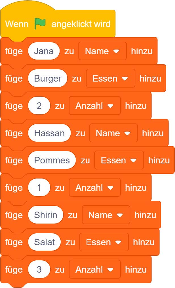 Erstellen Sie in einem neuen Programm zwei Listen mit den Namen „Name“ und „Essen“. Für die folgenden Aufgaben empfiehlt es sich, jeweils einen „lösche alles“-Block für beide Listen in den Programmierbereich zu ziehen.