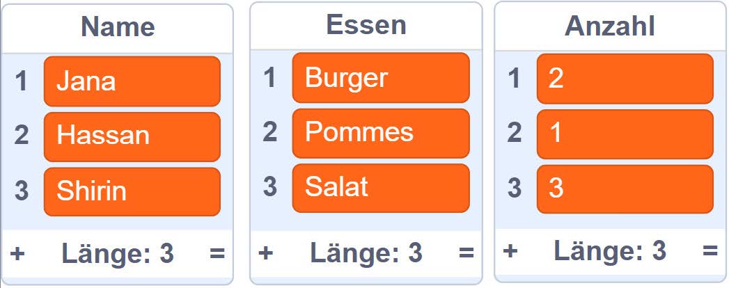 Überprüfen Sie mit einer bedingten Anweisung (z. B. „wenn-dann“-Block), ob in den Listen am Index 2 die Einträge „Samira“ (in der Liste „Name“) und „Pommes“ (in der Liste „Essen“) stehen.