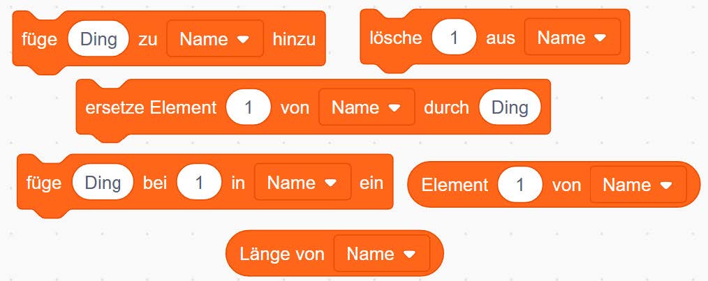 - (Einzelarbeit) Bevor Sie fortfahren, probieren Sie zunächst grundlegende Algorithmen mit einer Liste aus. Hierfür müssen Sie keinen vollständigen, zusammenhängenden Algorithmus implementieren. Die einzelnen Aufgabenteile können jeweils mit den dafür notwendigen Blöcken umgesetzt werden. Eine Liste erstellen Sie im Bereich „Variablen“.