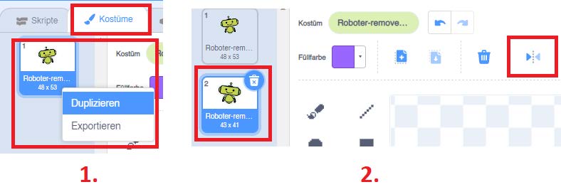 Die Lösung ist, das Kostüm der Figur zu duplizieren und horizontal zu spiegeln. So erhält man ein passendes Kostüm, wenn die Figur nach links gehen soll. Die beiden Kostüme muss man nun nur noch entsprechend dem Links- und Rechtsgehen zuweisen.