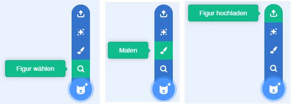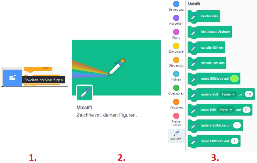 Jedes Objekt verfügt über einen Stift. Mit den passenden Befehlen aus dem Bereich „Malstift“ stellt man die gewünschte Farbe, Dicke usw. ein. Bewegt sich eine Figur auf der Bühne und wurde vorher „schalte Stift ein“ ausgeführt, so wird die Bewegung mitgezeichnet. Möchte man dies deaktivieren, muss man „schalte Stift aus“ ausführen.