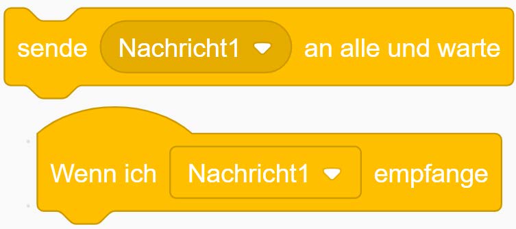 Eine Figur kann eine Nachricht aussenden, während eine andere Figur beim Empfang dieser Nachricht eine Aktion ausführen kann. Die hierfür benötigen Blöcke sind: