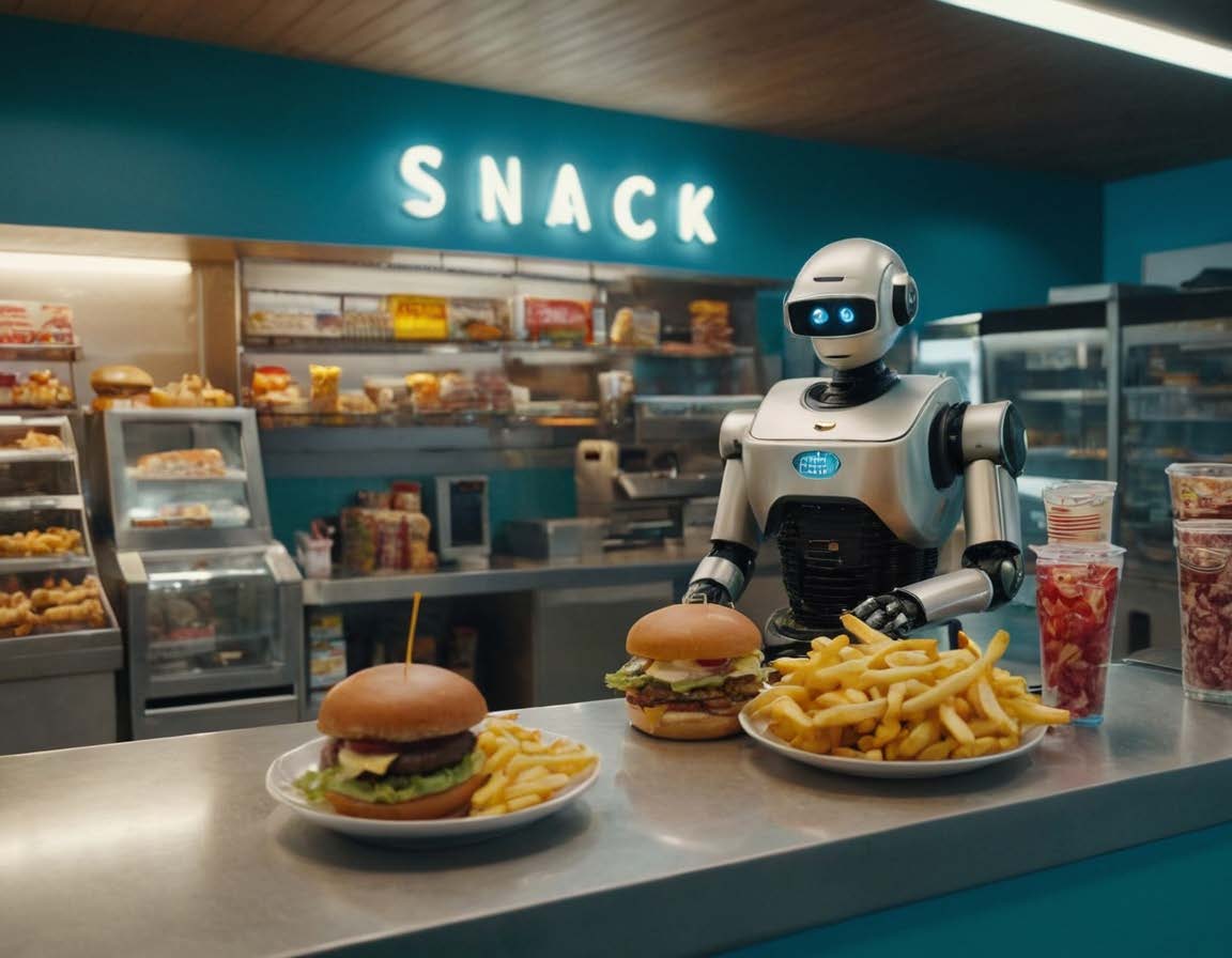 Unser Aquapark hat natürlich einen Imbisstand. Die Serviceroboter sollen auch Bestellungen abholen und zur Kundschaft bringen können. Wenn ein Kunde z. B. einen Burger bestellt hat, liegt das fertige Produkt beim Imbiss.