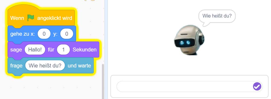 Die Antwort kann dann mit den Block „Antwort“ aus dem Bereich „Fühlen“ genutzt werden.