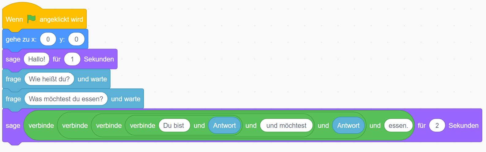 Verändere dein Programm so, dass die drei Antworten gespeichert werden und am Ende eine Zusammenfassung der Bestellung gesagt wird, in der die drei Antworten genutzt werden.