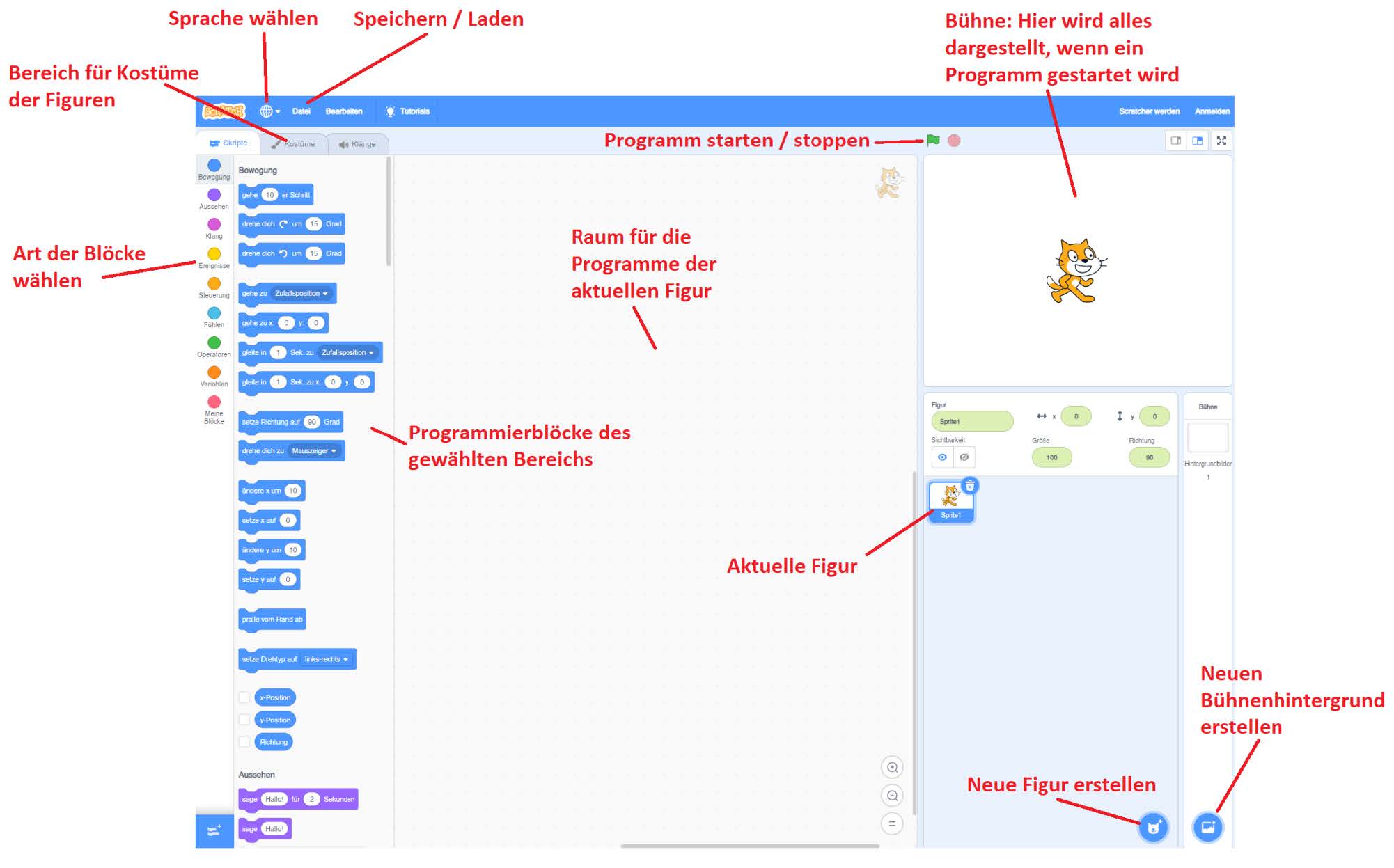 Mache dich mit der Programmoberfläche vertraut. Klicke die einzelnen Bereiche an und untersuche, was man auswählen und einstellen kann. Zum Beispiel kannst du die Sprache auf Deutsch stellen. Die Beschriftung an der obigen Skizze ist eine erste Orientierung.