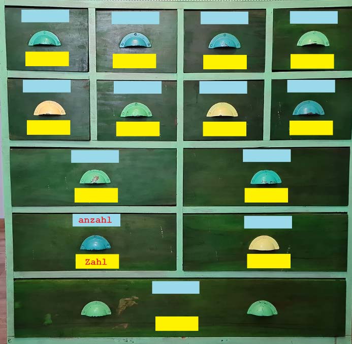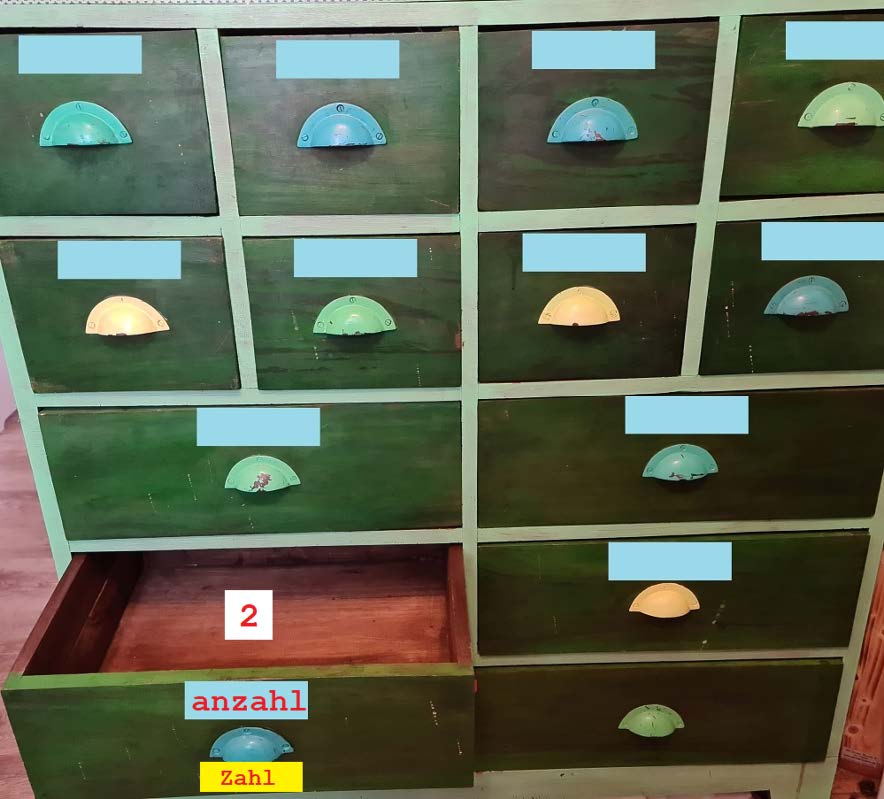 Jetzt sucht der Computer eine noch freie Schublade und schreibt sowohl den Datentyp, wie auch den Namen der Variablen auf diese Schublade.