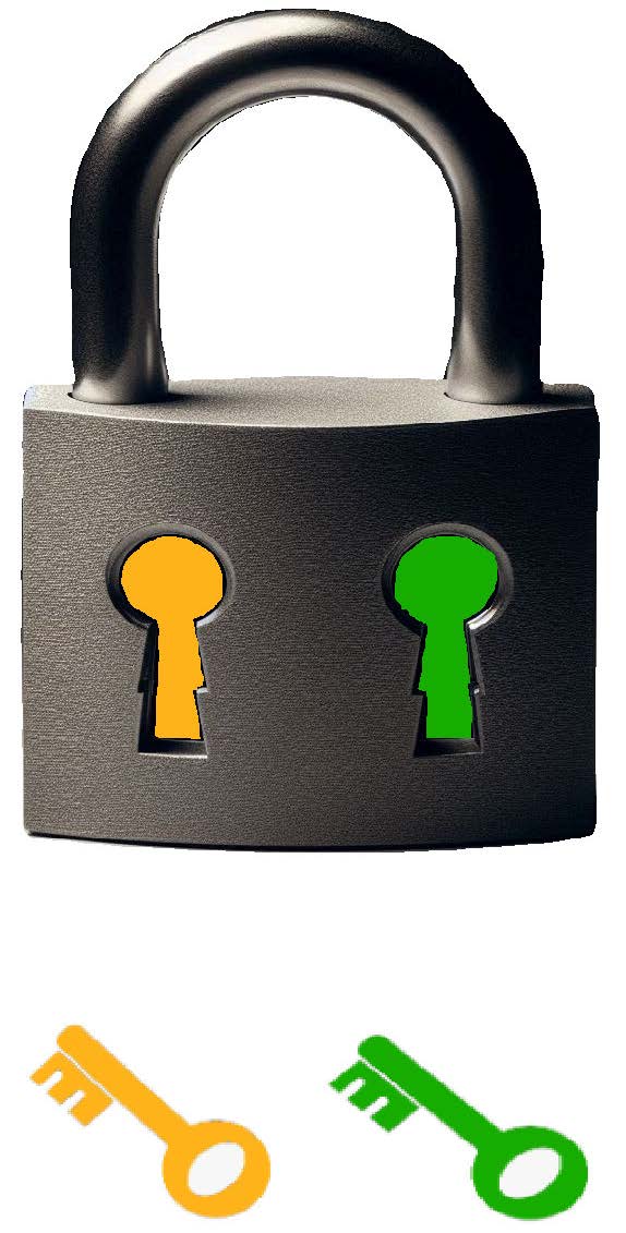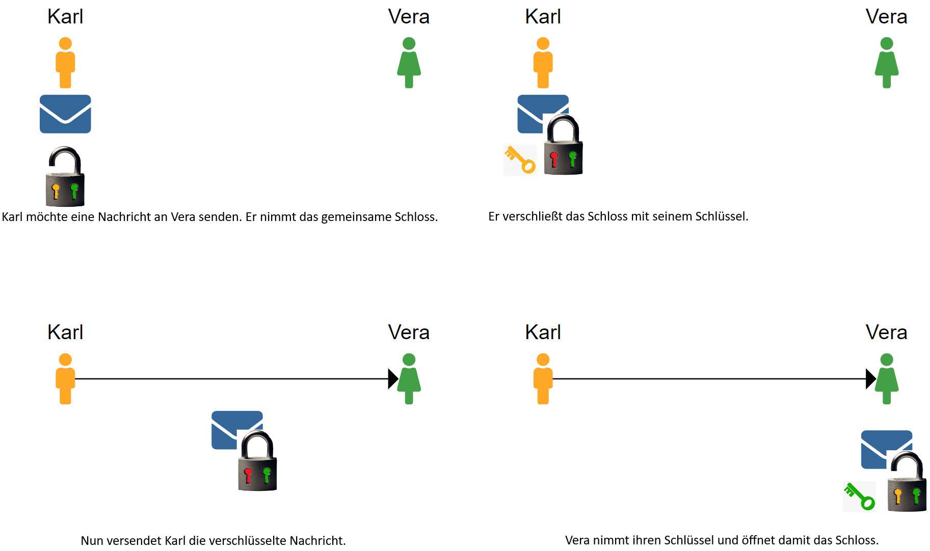 (Partnerarbeit) Wir erweitern das Szenario erneut. In der Realität ist es so, dass man sowohl mit einem Schlüssel, als auch mit einem Schloss verschlüsseln kann.