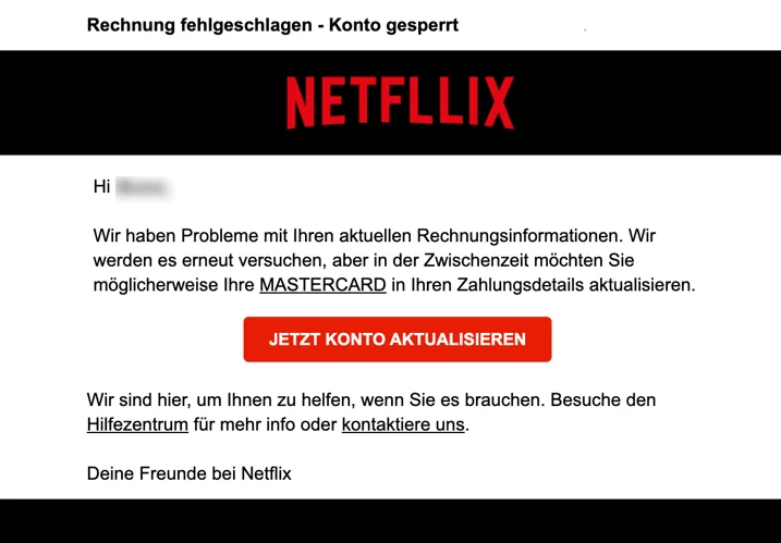 etwa von Netflix, PayPal oder Ihrer Bank. Die Mail sieht authentisch aus, enthält Logos und sogar persönliche Anreden.