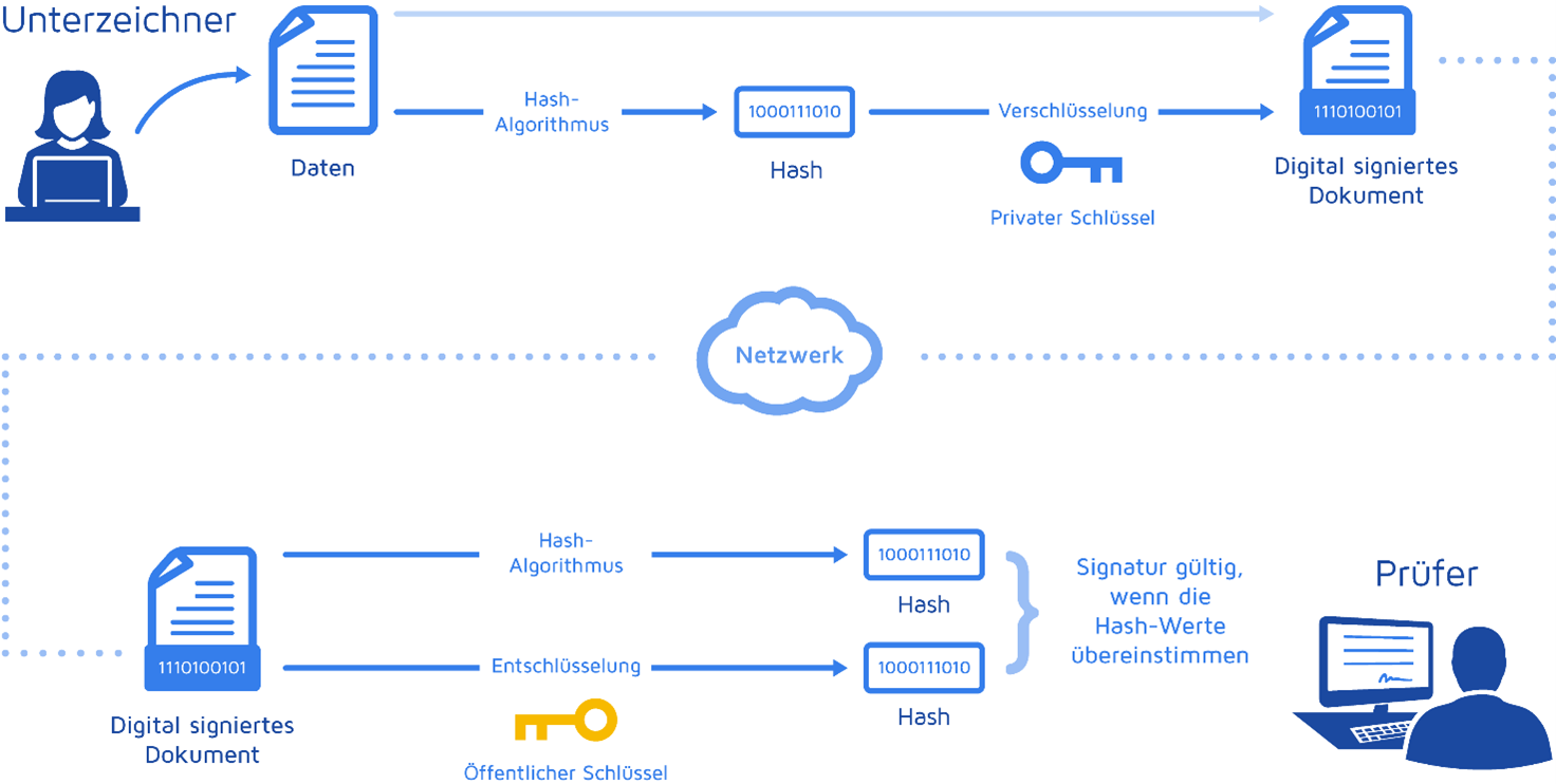 Somit ist die digital unterschriebene Nachricht erzeugt. Diese Nachricht wird dann übermittelt. Bob (der Empfänger) kann nun aus der Nachricht ohne digitale Signatur den Hash-Wert bestimmen. Mithilfe des öffentlichen Schlüssels von Alice (Senderin) (und manchmal auch mit seinem privaten Schlüssel) kann die digitale Signatur entschlüsselt werden. Stimmen nun der Hash-Wert aus der Nachricht und der entschlüsselte Wert aus der digitalen Signatur überein, weiß Bob, dass die Nachricht von Alice kommt und nicht verändert wurde.