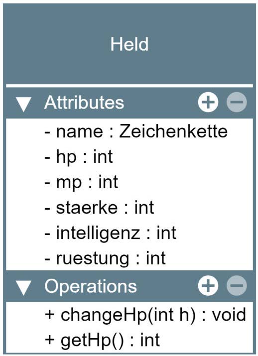 Es fällt wahrscheinlich auf, dass vor den Attributen plötzlich "private" steht. Das hat den Grund, damit andere Objekte nicht direkt auf die Attribute eines Helden zugreifen können. Die Sichtbarkeit der Attribute wird durch private so eingeschränkt, dass nur das Objekt selbst die Werte seiner Attribute sehen und ändern kann. Möchte man dies allen anderen Objekten, auch von Fremdklassen, erlauben, würde man "public" davor schreiben, wie bei den Operationen.