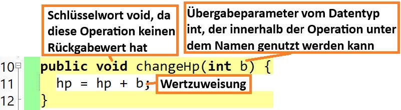 wieder löscht, ist die Bezeichnung b außerhalb von changehp(int b) frei und kann anderweitig genutzt werden. Man könnte also bei einer anderen Operation, die eine int als Übergabe erhält, diese ebenfalls als b bezeichnen.