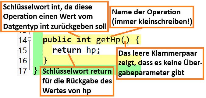 Mit der Operation gethp() soll ein Objekt der Klasse Held seine aktuellen hp zurückgeben.