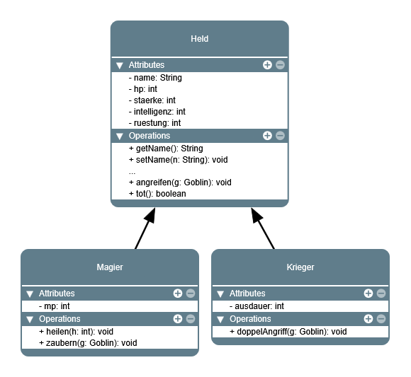 Entfernen Sie aus der Klasse Held alles, was mit Manapunkten zu tun hat und ergänzen Sie es, falls noch nicht geschehen, in der Klasse Magier und testen Sie Ihre Implementierung, indem Sie ein Objekt der Klasse Magier erzeugen.