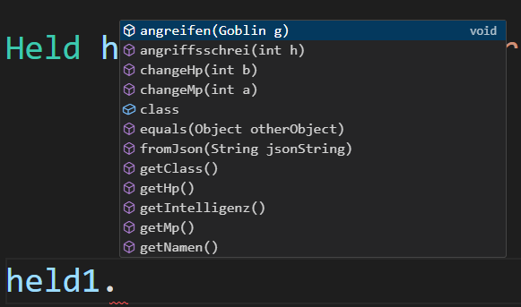 Erweitern Sie die Klasse Spiel so, dass Held und Goblin sich abwechselnd angreifen und das Spiel endet, wenn einer der beiden tot ist. Fügen Sie weiterhin sinnvolle Textausgaben hinzu.